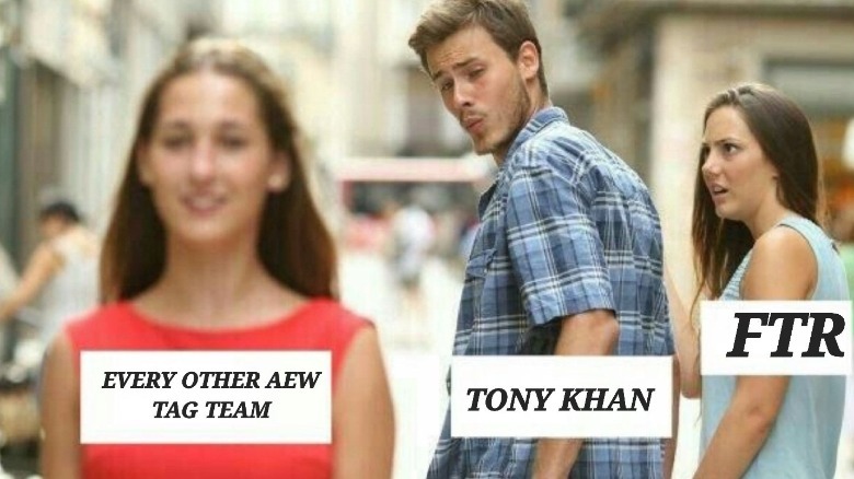Harwood took to Twitter to declare that a meme was "genuinely funny." A spin on the distracted boyfriend meme, the image paints Tony Khan as a promoter that — despite being committed to FTR — has an eye that wanders to "every other AEW tag team."