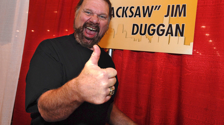 WWE Hall of Famer "Hacksaw" Jim Duggan has been belting out his signature yell, calling out "tough guys," and swinging 2x4s for more than 40 years. In his illustrious career, Duggan battled some of the top stars in the business, including Hulk Hogan, "Macho Man" Randy Savage, Jake "The Snake" Roberts, Sgt. Slaughter, Shawn Michaels, The Big Bossman, Shawn Michaels, and "Ravishing" Rick Rude. Infamously, Duggan holds the honor of winning WWE's first-ever Royal Rumble back in 1988, lastly eliminating One Man Gang by dumping him over the top rope.