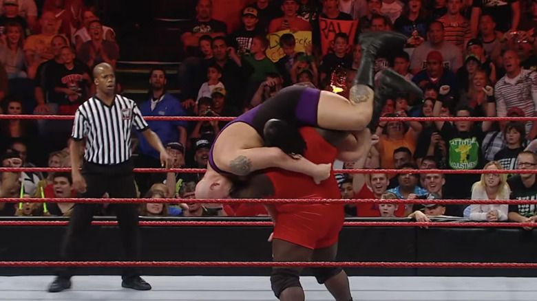 Braun Strowman is similar to Brock Lesnar in that he has used his seismic in-ring collisions with The Big Show to help transform himself into a star. One such match saw Strowman duplicate Lesnar's superplex spot on The Big Show during an episode of "Raw" in April 2017. However, the superplex proved to not be the only feat of strength performed by the 6'8, 344-pound Strowman during the match. The former strong man lifted The Big Show up over his right shoulder and slammed him to the mat with a vicious power slam, a move that is essentially a falling body slam (sometimes while running). While impressive, Strowman went on to execute the move on The Big Show on several different occasions.