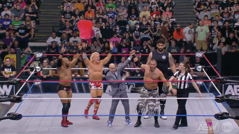 Back in the ring, Jake Hager, Matt Menard, and Angelo Parker are waiting. Menard and Parker mock The Acclaimed with a rap of their own. Menard brags about beating The Acclaimed, then says joining the Jericho Appreciation Society is a no-brainer because everyone wants to be a sports entertainer. Parker then says they didn't come here to play and adds he's having a good hair day. Hager talks about his beloved purple bucket hat before The Acclaimed's music hits. Max Caster, Anthony Bowens, and Billy Gunn appear, and Caster looks to rap, but says forget it. The three men then charge at the JAS members and a massive brawl breaks out. Gunn sends Hager over the barricade as Parker is tossed to the outside. Caster and Bowens then hold Menard in place as Gunn holds up a pair of scissors. Hager and Parker pull Menard out of the ring before Bowens challenges Menard, Parker, and Hager to a trios match next week on "AEW Dynamite".