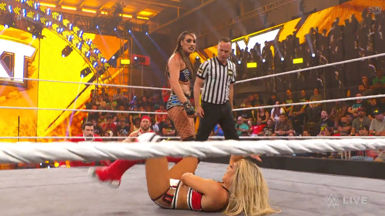 Back at ringside, Jacy Jayne heads down. Chase U follows.
