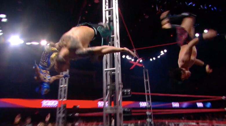 Bailey tries to grab the X with his toes as Ace, Wentz, and Angels approach on each side. Wentz sprays Ace to knock him down. Bailey kicks away at Wentz to knock him off. Bailey and Angels kick each other and then fall to the mat. Angels goes back up and slides down the cable. Ace and Bailey start climbing but Ace unhooks the X. Ace and Angels fall but Angels escapes with the X to officially win.