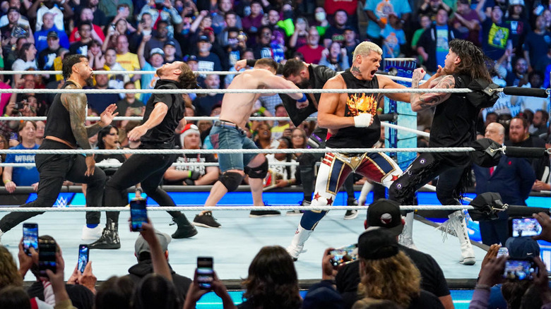 Jimmy Uso and Solo Sikoa representing The Bloodline, plus Damian Priest, Finn Balor, and Dominik Mysterio from The Judgment Day makes for one hell of a WarGames team (and if you want to get crazy, add Reigns to the mix for a six-man squad) On the other side, we have Cody Rhodes, Jey Uso, LA Knight, and you loop Sami Zayn and Kevin Owens back in, right? And if we want to assume John Cena's hanging around for a bit longer (he looks like he's having fun, right?) then you have a 12-man melee for the ages. Not to mention Ripley, Heyman, JD McDonagh, et al. hanging around on the outside!