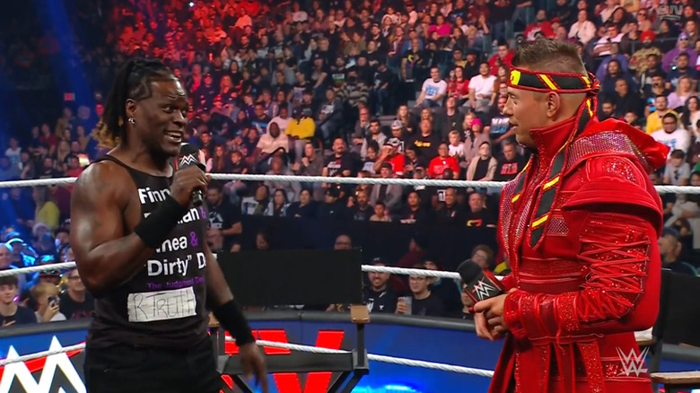Judgment Day's music hits, but R-Truth's music cuts it off and he makes his way down to the ring. Miz welcomes him, then asks where the rest of Judgment Day is. Truth says they were just behind him and tells fans to rise for Judgment Day. Miz asks Truth what his role in Judgment Day is, and Truth says he has many roles. He says he's doing PR today while he was doing administrative work last week. He says he's on a mission to make Judgment Day likable to everybody.