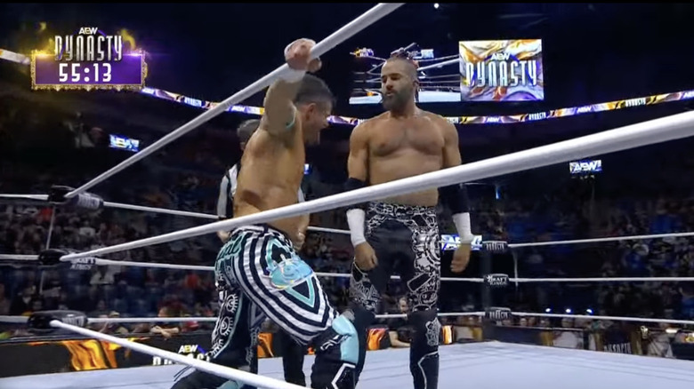 Moriarty tags in and looks to roll up Cassidy, but Cassidy prevents him from doing so and tags in Shibata. Shibata delivers a boot to Moriarty, then fires off strikes on him in the corner and lands a dropkick. Shibata locks in an Abdominal Stretch on Moriarty, but Taylor breaks the hold. Cassidy tags in and fires off chops on Taylor in the corner with Shibata. They follow it up with stomps and a double dropkick, but Moriarty blindsides Shibata with a boot. Cassidy sets up for Beach Break, but Moriarty avoids it. Cassidy hits Stun-Dog Millionaire, but Moriarty responds with a Sliced Bread. He locks in the Border City Stretch, but Moriarty avoids it.