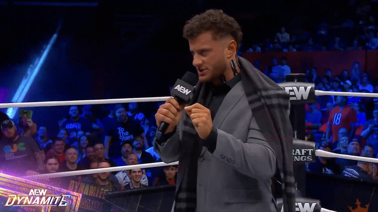 MJF says he's in a tremendous amount of pain right now after All In, then warns the audience about being loud unless they want to receive a beating. He grabs onto his neck wrapped up in KT Tape, then says he lost the International Championship, "Dynamite" Diamond Ring, and herniated two disks in his spine on Sunday. He then formally denounces his American citizenship and says he's sick of the lies. He says AEW would be a circus without him, then addresses Will Ospreay. He says everyone knows that he had Ospreay beat and he had to cheat to regain the International Championship. He says their issues are far from over.