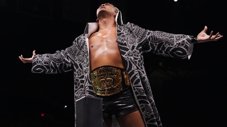 Here comes Okada, who is wearing the title belt and a very nice black-and-white dragon trenchcoat. And now Sammy Guevara is here, accompanied by his ROH tag team champion partner Dustin Rhodes.