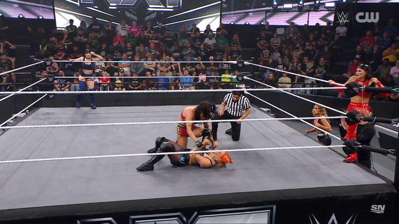 The bell rings and Jordan continues weaning down Perez. Giulia tags in and gets in Perez's face, but Perez blindsides her from behind and fires off stomps on her in the corner thanks to a distraction from Jade. Jade then tags in and sends Giulia crashing into the middle rope face first, but Giulia tags out to Jordan. Giulia and Jordan double team on Jade, and Jordan connects with an arm drag on Jade. Perez tags in, but Jordan catches her with a pair of arm drags and a dropkick. She whips Perez into the opposite corner and tags in Giulia before Perez and Jordan are sent crashing out of the ring.