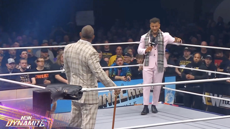 The Hurt Syndicate's music hits, and MVP makes his way down to the ring. MJF says MVP is a legend, and after everything that went down between him and Adam Cole, he promised that he would never do friends again. He says he's been looking at the business card MVP gave to him, then reveals he would like to be in the business of hurting people.