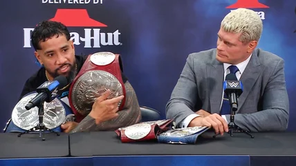 From Uso apologizing for cursing by saying, 'Sorry, honey,' to Rhodes' now iconic line: "Do you feel him, sir?," the press conference includes countless gems. When Rhodes and Uso finally wrapped up, it was Michael P.S. Hayes who chastised them for getting intoxicated before speaking to the press. Rhodes defended himself and Uso by emphasizing that they were asked to participate at the last minute, and they both felt like they were ready to do it.