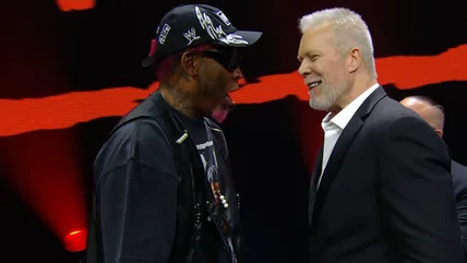 Rodman then made his entrance to the OG NWO theme. He said he had a speech prepared for him by Stephanie McMahon, but continued to amble on about WWE being the greatest sports organization in the world off-the-dome.