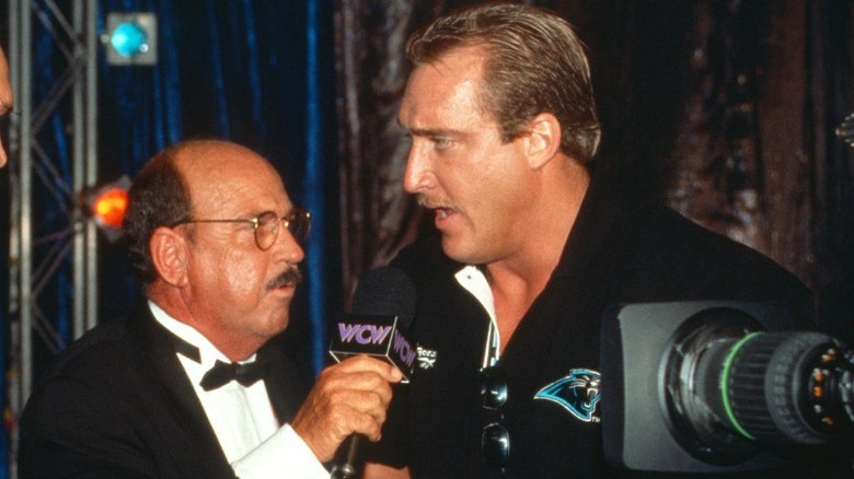 There to promote the upcoming film "Robocop 2," our steel-covered buddy was brought in to be Sting's backup against the Four Horsemen. It resulted in a camp classic segment, where Sting found himself locked inside a small steel cage at ringside only for Robocop to slowly walk to the ring, bend the bars of the cage, and tear the door off its hinges. The Horsemen had to sell that they were terrified by this figure moving at the speed of a turtle. On commentary, Jim Ross had to say surreal things like, "Sting and Robocop have asserted themselves here!" Depending on your taste, you may have seen it as wrestling at its best or at its worst, but certainly, it was at its goofiest.