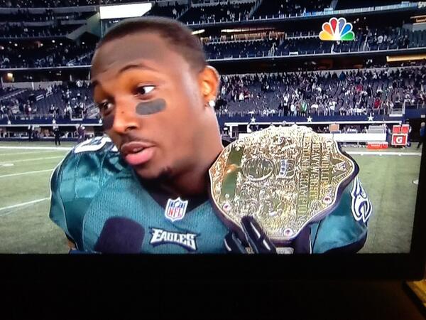 - As noted earlier, Philadelphia Eagle LeSean McCoy wore a World Heavyweight Title belt after last night's Sunday Night Football game for his season rushing title. WrestlingINC.com reader Mike P. passed along this photo of McCoy wearing the belt:
